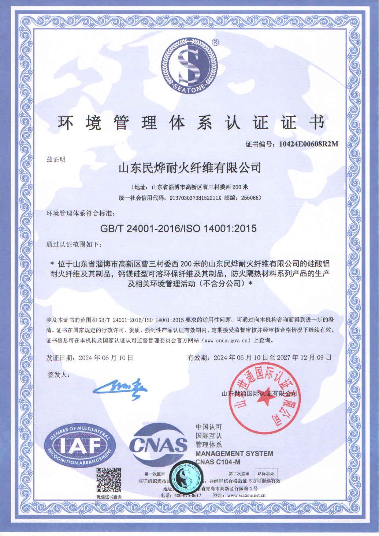 環(huán)境管理體系認(rèn)證證書
