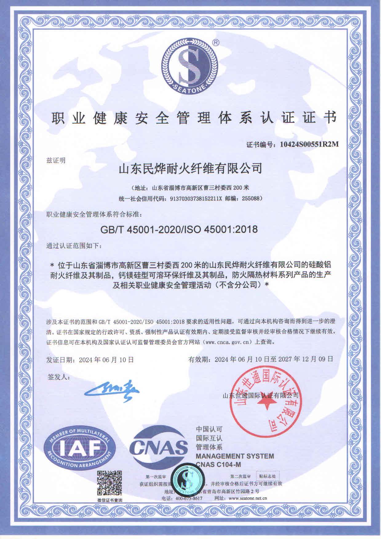 2024年職業(yè)健康體系認(rèn)證證書